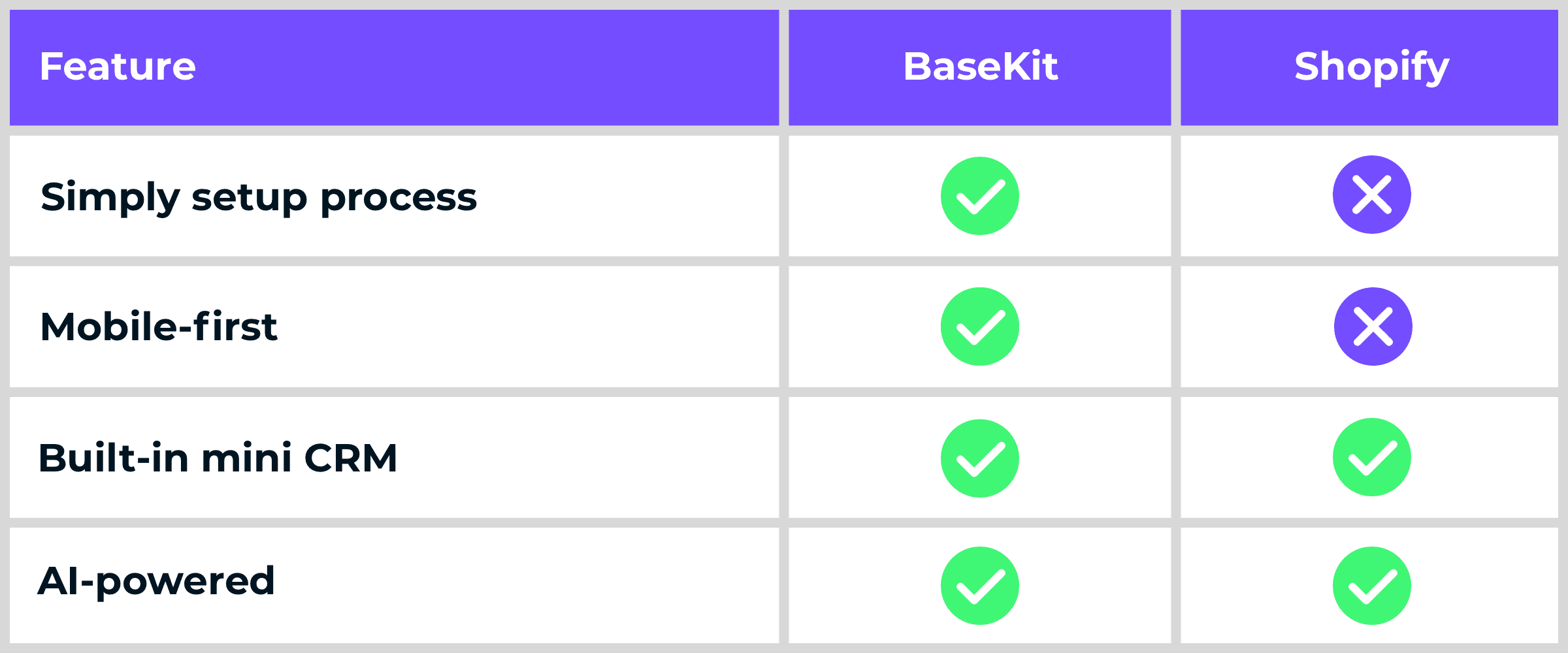 Both enable merchants to launch professional online stores, but they were built for different audiences and business models. BaseKit Store is an exclusive white-label product, designed for enterprise businesses that need a simple, resellable, e-commerce solution for small businesses, while Shopify is a direct-to-merchant platform aimed at individual businesses of many different sizes. Here’s how they compare across Simplicity, Scalability and Support.