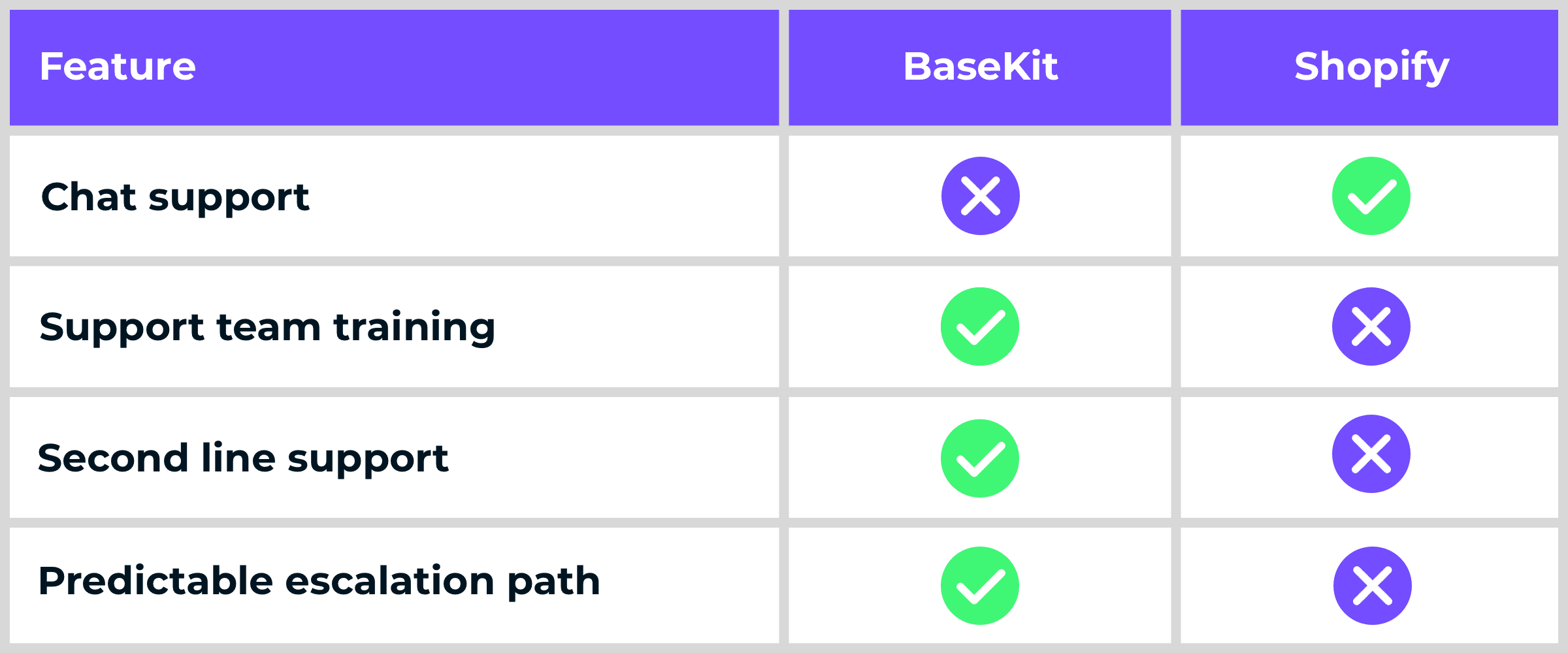 For resellers who need aligned partner and end-user support, BaseKit’s structured model provides clear escalation channels and training. Shopify’s support is excellent for individual merchants but not designed for partner-level operations.