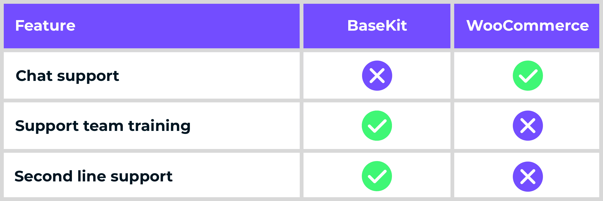 BaseKit Store provides structured support aligned with partner operations, while WooCommerce’s community model suits developers and agencies managing their own client relationships.