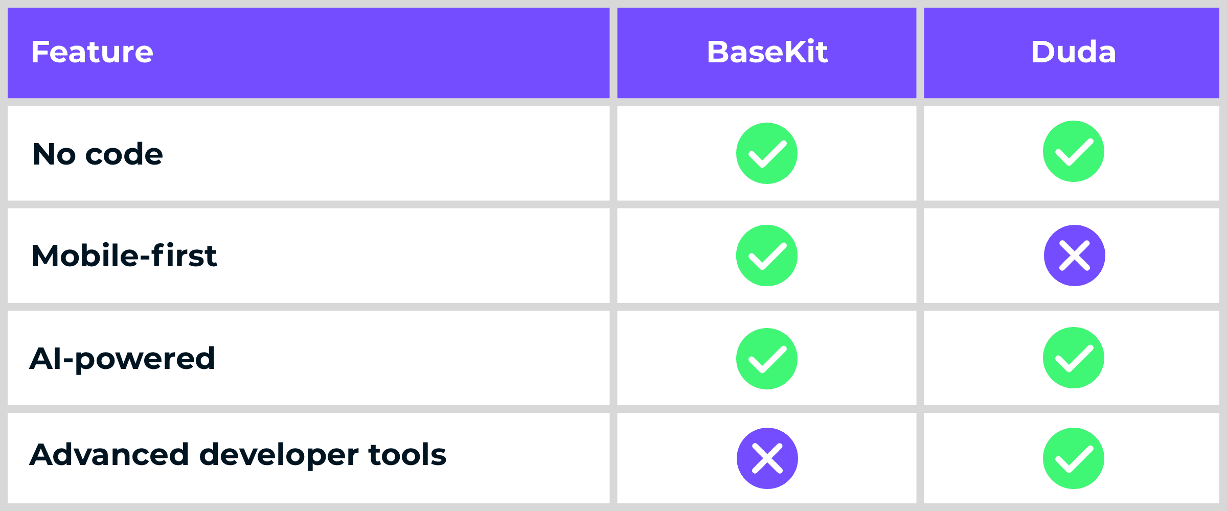 BaseKit is optimised for partners that want to serve a high number of small businesses. Duda is optimised for agencies and web professionals who build sites for clients with more customisation needs.