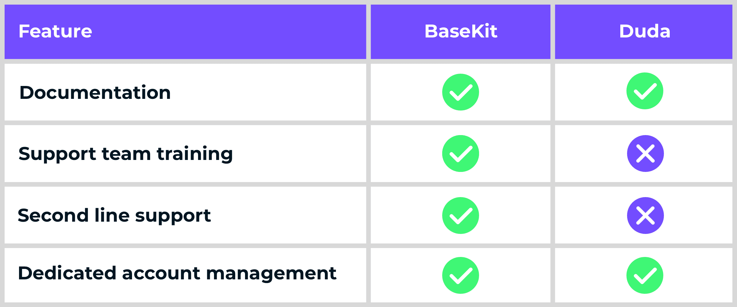 BaseKit’s support model is built around partner co-operation and small business activation and enablement. Duda focuses on agency support, which is effective for design-led businesses but not purpose-built for telecoms, banks or hosting partners, or other enterprise level businesses distributing at scale.